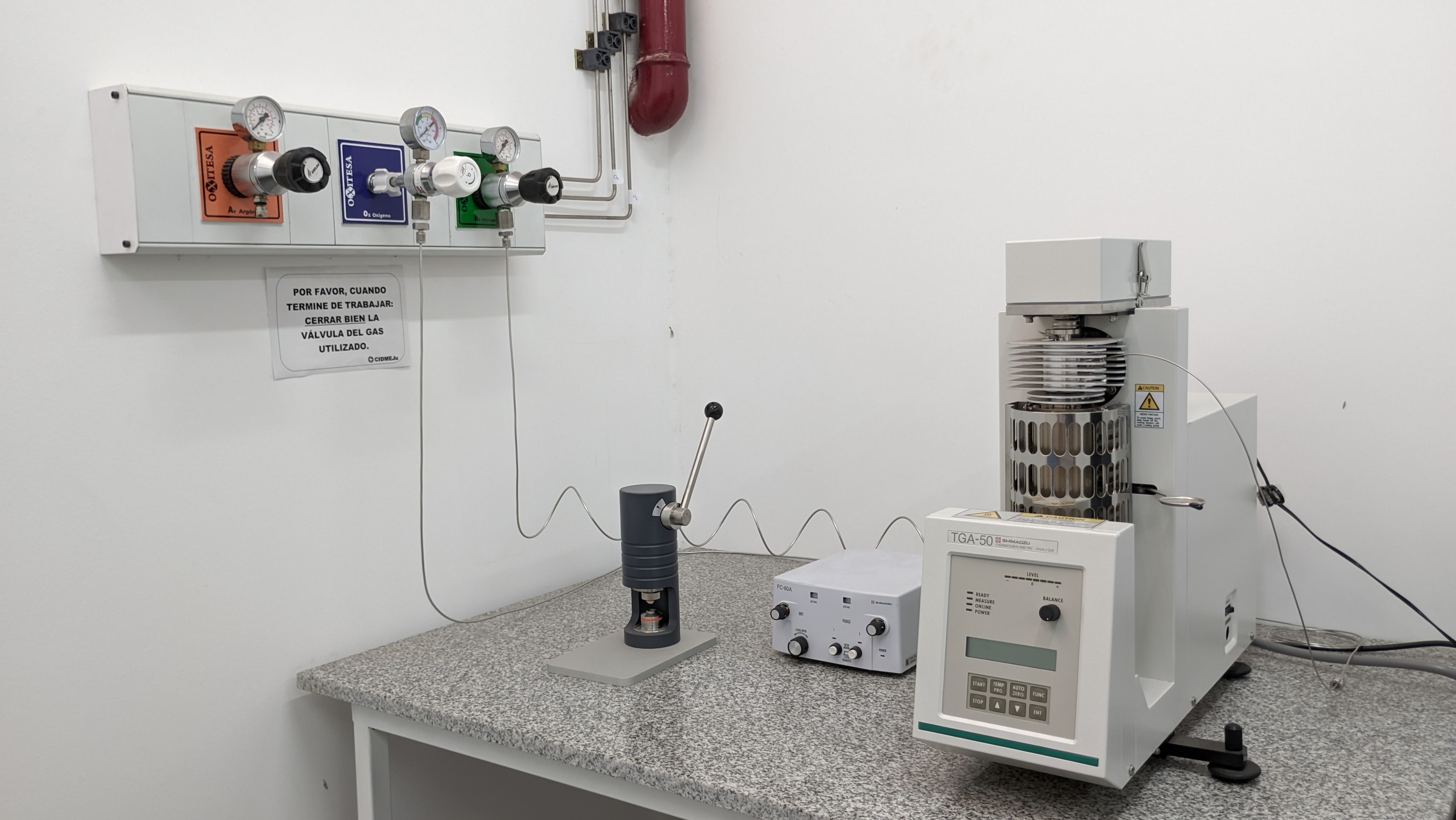 El dispositivo termogravimétrico que el CIDMEJu posee un es analizador termogravimétrico de la serie TGA-50 marca Shimadzu que está equipado con una termobalanza, un horno, un sistema de control y temperatura de la balanza, un sistema de gas de purga y un microprocesador.