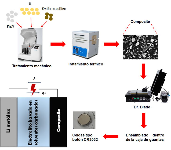 Las baterías de Li-S están formadas por un ánodo de litio metálico, un separador aislante eléctrico, que contiene un electrolito, formado por una sal de litio y un solvente orgánico no prótico, y un cátodo que contiene azufre. Durante el proceso de descarga, el litio metálico es oxidado a iones litio (Li+) en el ánodo, mientras que, en el cátodo, y en presencia de iones litio, el azufre elemental es reducido mayormente a sulfuro de litio (Li2S). Nuestros estudios se centran en desarrollar materiales que puedan ser usados como materiales soportes/conductores para el azufre, tales como: materiales carbonosos (ya sea procedentes de desechos/biomasa o de síntesis que utilicen métodos sencillos y reactivos químicos de bajo costo) y materiales no carbonosos basados en poliacrilonitrilo (PAN) y óxidos metálicos.