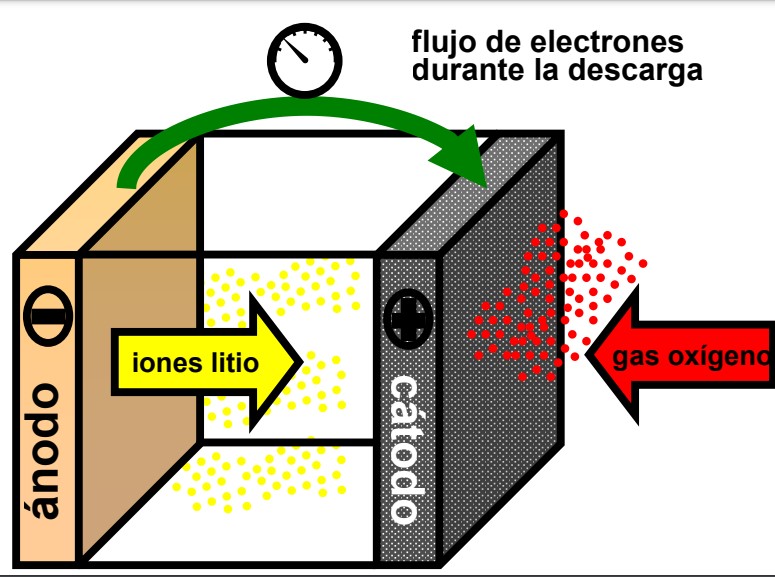 En estas baterías se encuentran los tres estados de la materia: sólido (litio metálico, ánodo), líquido (electrolito) y gaseoso (oxígeno, cátodo). La naturaleza de los componentes de esta batería hace que la capacidad de la misma, la cantidad de energía que puede almacenar, sea muy alta. En el grupo exploramos diferentes electrolitos (solventes-sales) que contengan aditivos que faciliten los procesos de carga-descarga (principalmente mediadores redox) para conseguir mejoras en su ciclabilidad, lo cual incrementa su tiempo de vida útil.